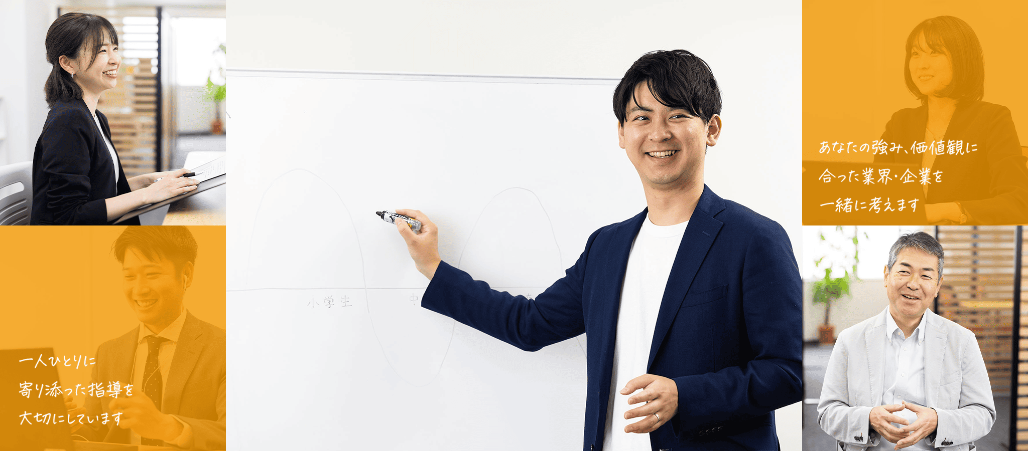 納得の内定を獲得するためには、 “企業で評価されそうな自分”を演出することよりも、 まず「自分を理解すること」が大切です。 自らの価値観を知ることで企業選択ができ、 個性や強みを理解することで、 自信をもって選考に臨むことができます。 とはいえ、「価値観」「自分らしさ」というものは、 一人では見つけにくいものです。 悩んだ時こそ、孤独にならずにキャリアアカデミーを頼ってください。 講師が皆さんと向き合い、対話を重ねることで、 「あなたらしさ」を最大限に引き出します。 講師・スタッフ一同、あなたに寄り添い、 最後まで伴走してまいります。 そして皆さんが内定をゴールとするのではなく、 社会人になってから、いきいきと働き、 社会で活躍する人材になることを応援します。